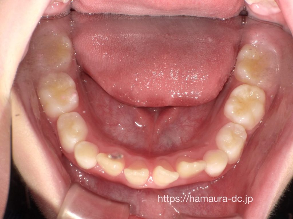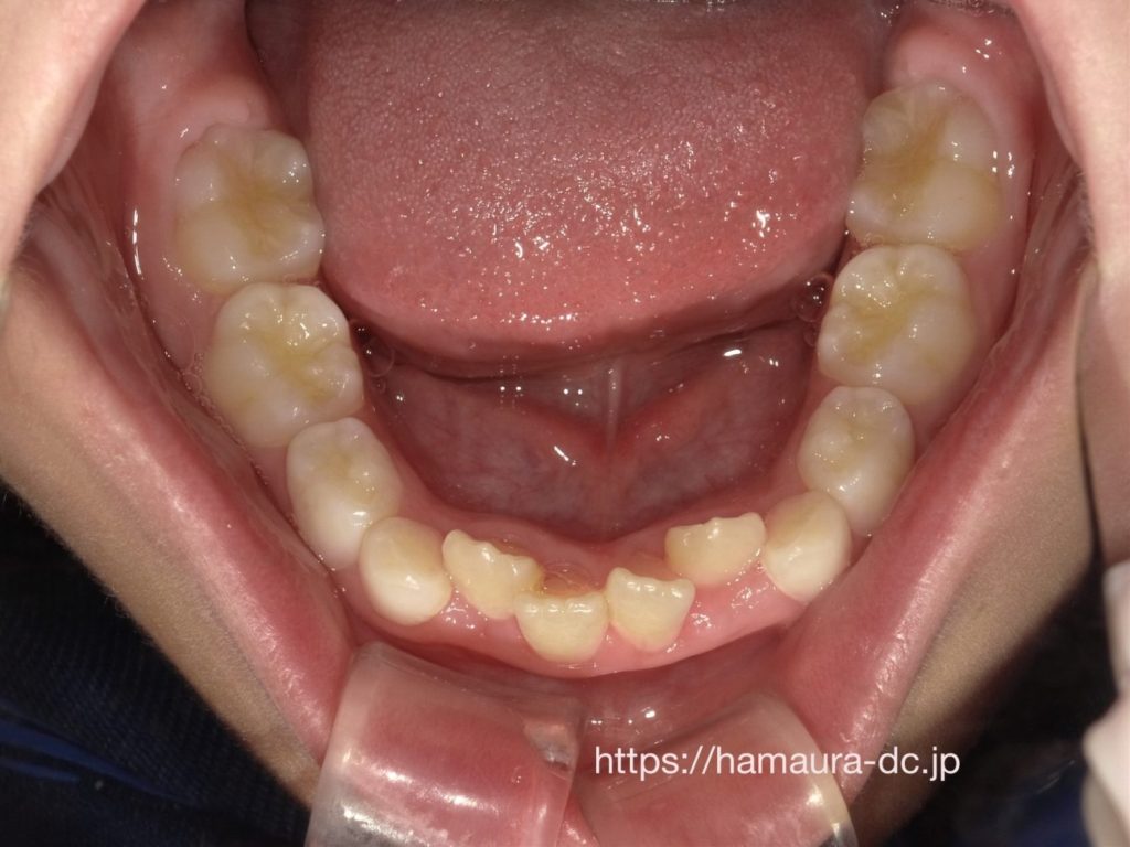 下顎の前歯3本が上の前歯より前にある受け口の状態でしたが、現在は安定した歯ならびを維持しています。歯と歯の間にもスペースがあり、永久歯が放出する十分な余裕があります。
